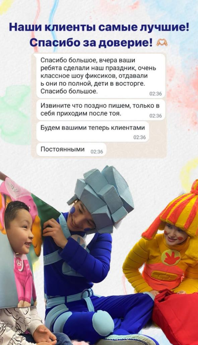 К нам возвращаются из года в год, а это лучший показатель доверия наших клиентов и качества наших праздников.
